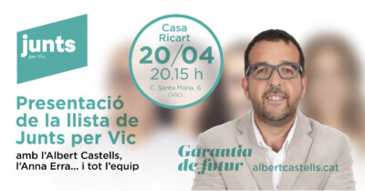 La presentació tindrà lloc el dijous, 20 d’abril, a les 20:15h, als jardins de la Casa RicartEl candidat de Junts a l’alcaldia de Vic, ...